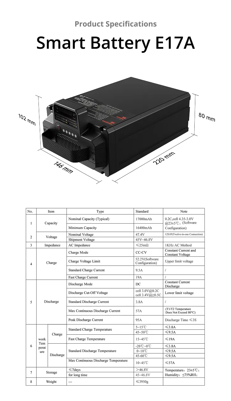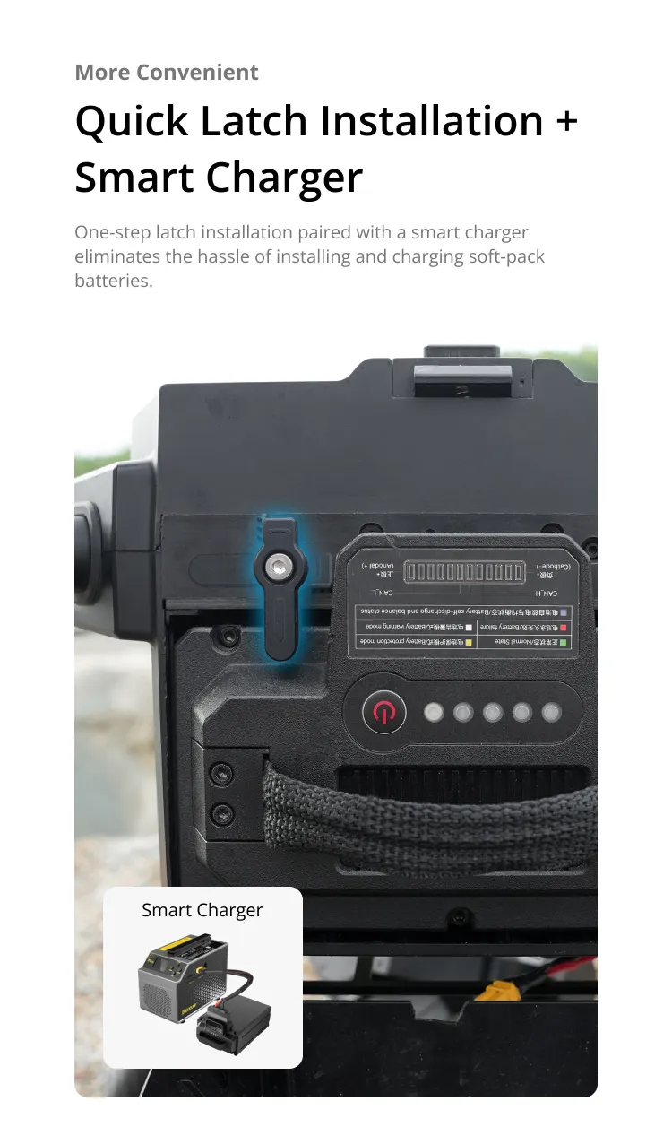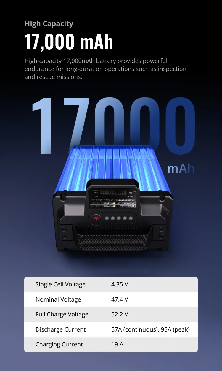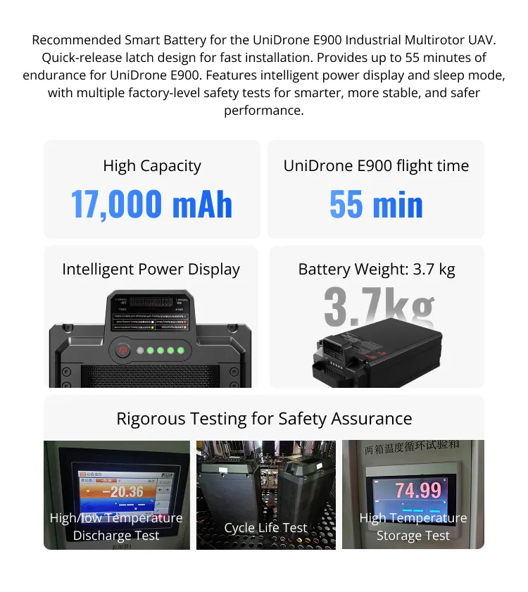 🔍 Home Shop Smart Batteries Drone Smart Battery E17A Drone Smart Battery E17A 17000mAh 3.7kg Quick Latch Installation Dual-Channel Smart Charger Long Endurance Suitable for UniDrone E900 or other Drone Platforms Smart Battery & Charger 描述 Related products Quick view icon Charging Cable for E17A Smart BatteryPower, Smart Batteries Request a Quote!