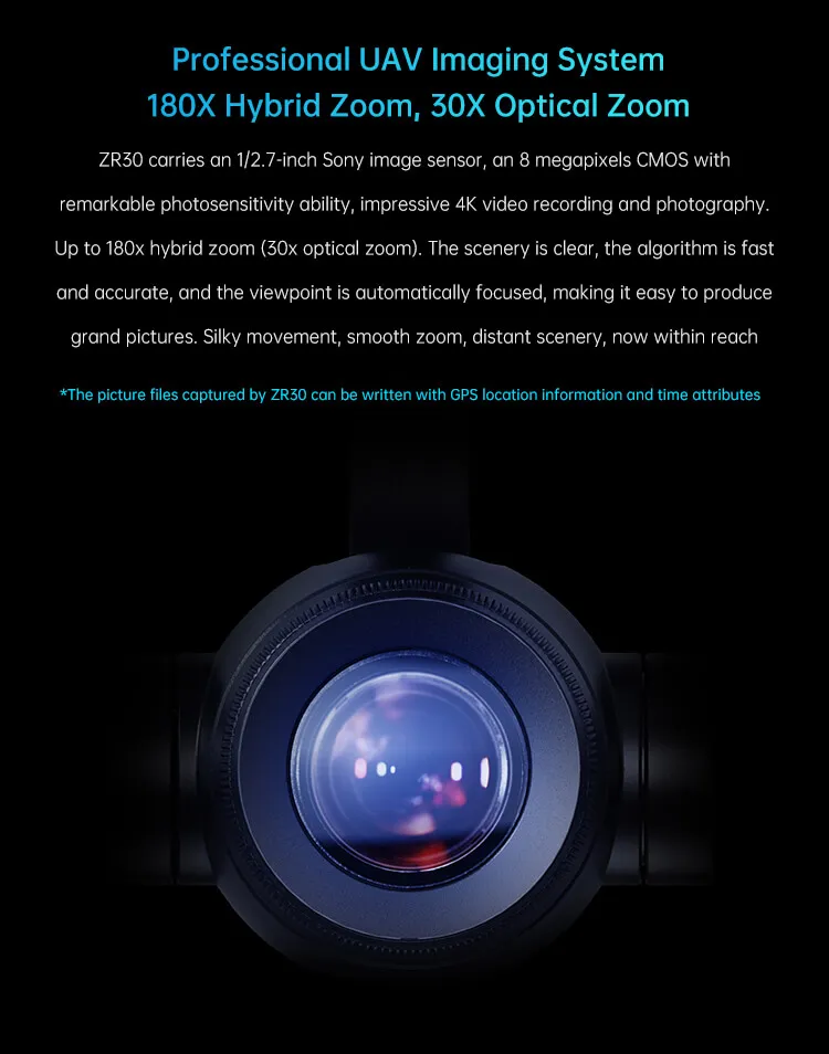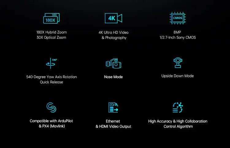 🔍 Home Shop Optical Pods ZR30 ZR30 180倍混合变焦,30倍光学变焦,支持 4K超高清视频和照片拍摄, 800万像素1/2.7英寸索尼CMOS传感器, 540度偏航轴旋转,快速释放,支持 机头模式和 倒置模式, 兼容ArduPilot和PX4(Mavlink), 以太网和HDMI视频输出, 高精度、高协同控制算法 描述 Related products Quick view icon Ethernet to HDMI ConverterPayloads Request a Quote! Quick view icon AI Tracking Module IIPayloads Request a Quote! Quick view icon UniPod MT11Optical Pods, Payloads Request a Quote! Quick view icon ZR10Optical Pods, Payloads Request a Quote! Quick view icon A8 miniGimbal Cameras, Payloads Request a Quote! Quick view icon A2 miniGimbal Cameras, Payloads Request a Quote!